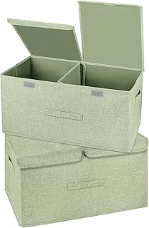 Valease 2パック 大きなリネン生地 折りたたみ式収納容器 蓋とハンドル付き 洗える収納ボックス バスケットキューブ 取り外し可能な仕切り付き 寝室 クローゼット オフィス リビングルーム 保育園用 L グリーン