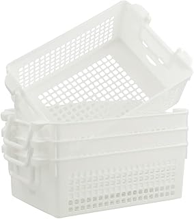 Inhouse プラスチック収納バスケット ハンドル付き スタッキングバスケット ホワイト 4個パック