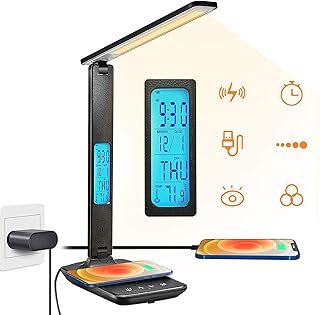 【10W Qiワイヤレス充電】デスクライト LED 電気スタンド 卓上ライト スタンドライト 目に優しい【2021年最新LCDディスプレイ版/目覚まし時計付/多角度調整】省エネ 机 テーブルスタンド タッチセンサー調光 USBポート付け 読書 勉強 仕事 USBライト 折り畳み式 おしゃれ 日本語説明書付き (黒い)